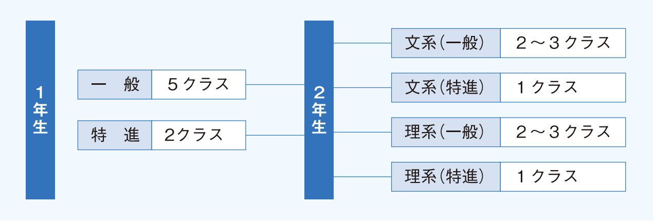 クラス全員が国公立大学進学を目指します。手厚い課外(朝課外、放課後課外、勉強合宿・通学学習会)を通して、学力を向上させます。1年次の特進クラスは入学時の希望に応じて編成しますが、2年次からは、進路希望に応じて、クラス編成が行われます。