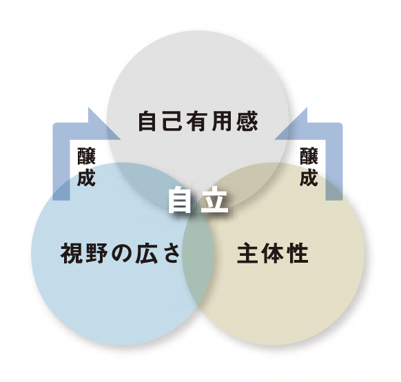 生徒一人ひとりの自立に向かって、未来起点の思考と日常の凡事の徹底により、高校生活(学習、部活動、学校行事等)を通して、3つの資質・能力(自己有用感、視野の広さ、主体性)を育んでいます。